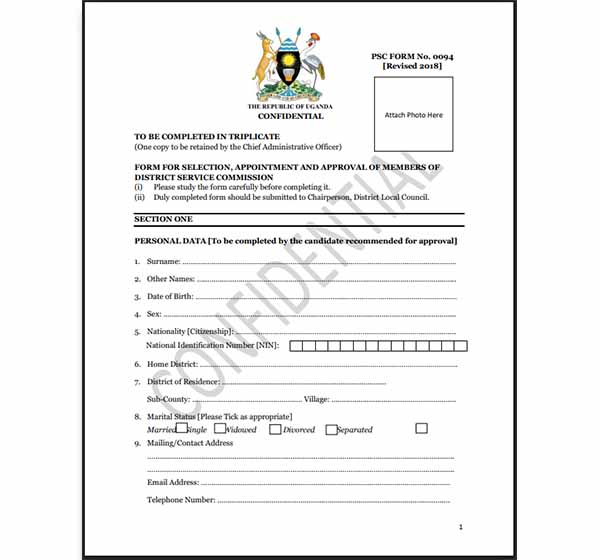 PSC Form No. 0094 (Revised 2018) is an official administrative form issued by the Public Service Commission and District Service Commissions in Uganda for the selection, appointment, and approval of members of District Service Commissions. The form is completed during the formal appointment process and captures detailed personal information, academic and professional qualifications, employment history, integrity declarations, and suitability details of proposed commission members. It is a confidential document and is completed in triplicate, with copies retained by responsible authorities such as the Chief Administrative Officer, to ensure proper record-keeping and accountability in public service appointments.