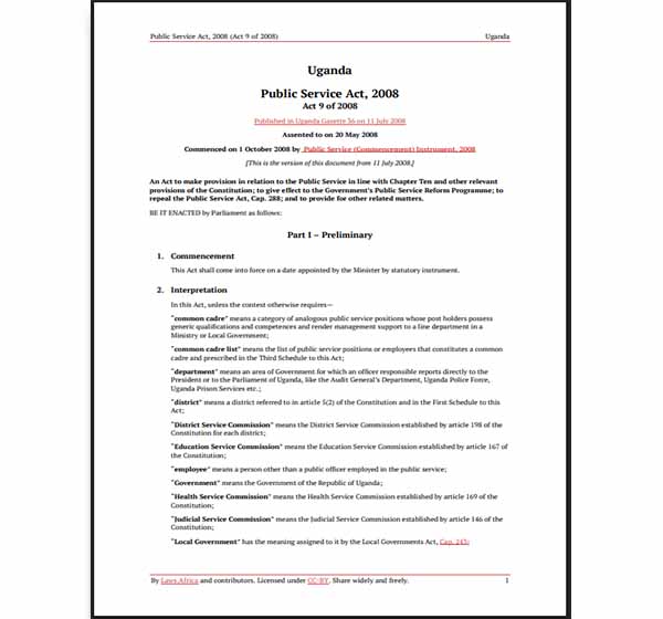 The Public Service Act, 2008 is the principal law that governs the organisation, management, and administration of the Public Service in Uganda. It establishes the legal framework for the structure of the public service, defining the roles and responsibilities of key institutions such as the Public Service Commission, Ministries, Departments, Agencies, and local governments. The Act provides for matters relating to appointment, confirmation, promotion, transfer, discipline, and removal of public officers, and it sets standards aimed at ensuring efficiency, professionalism, transparency, and accountability in public service administration.